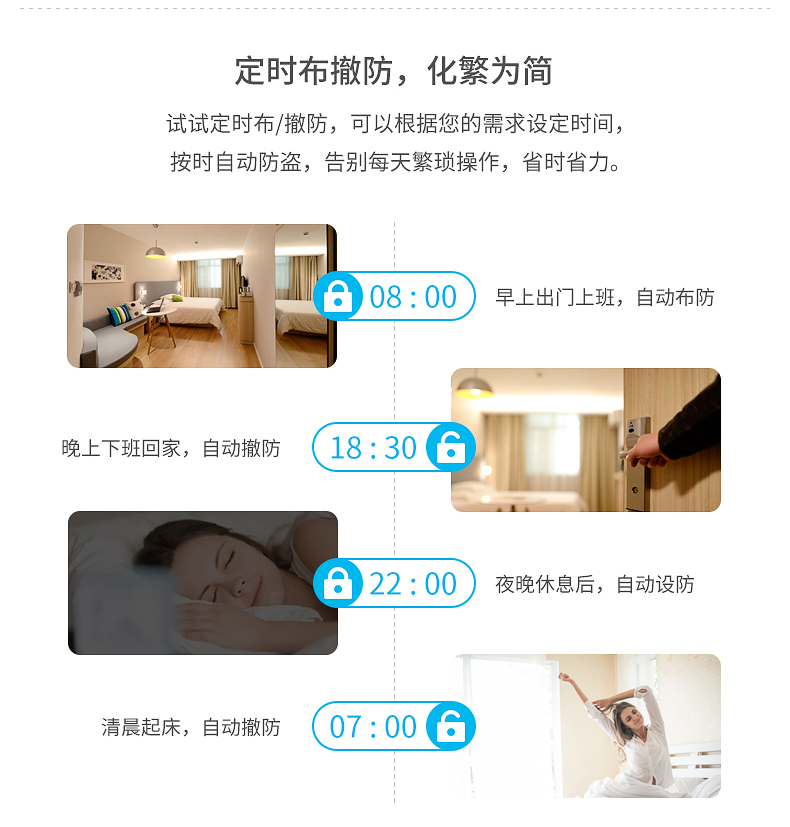 ● 支持外出防区、留守布防、门铃、静音布防、24小时防区等防区类型设置;